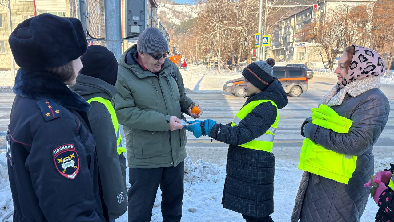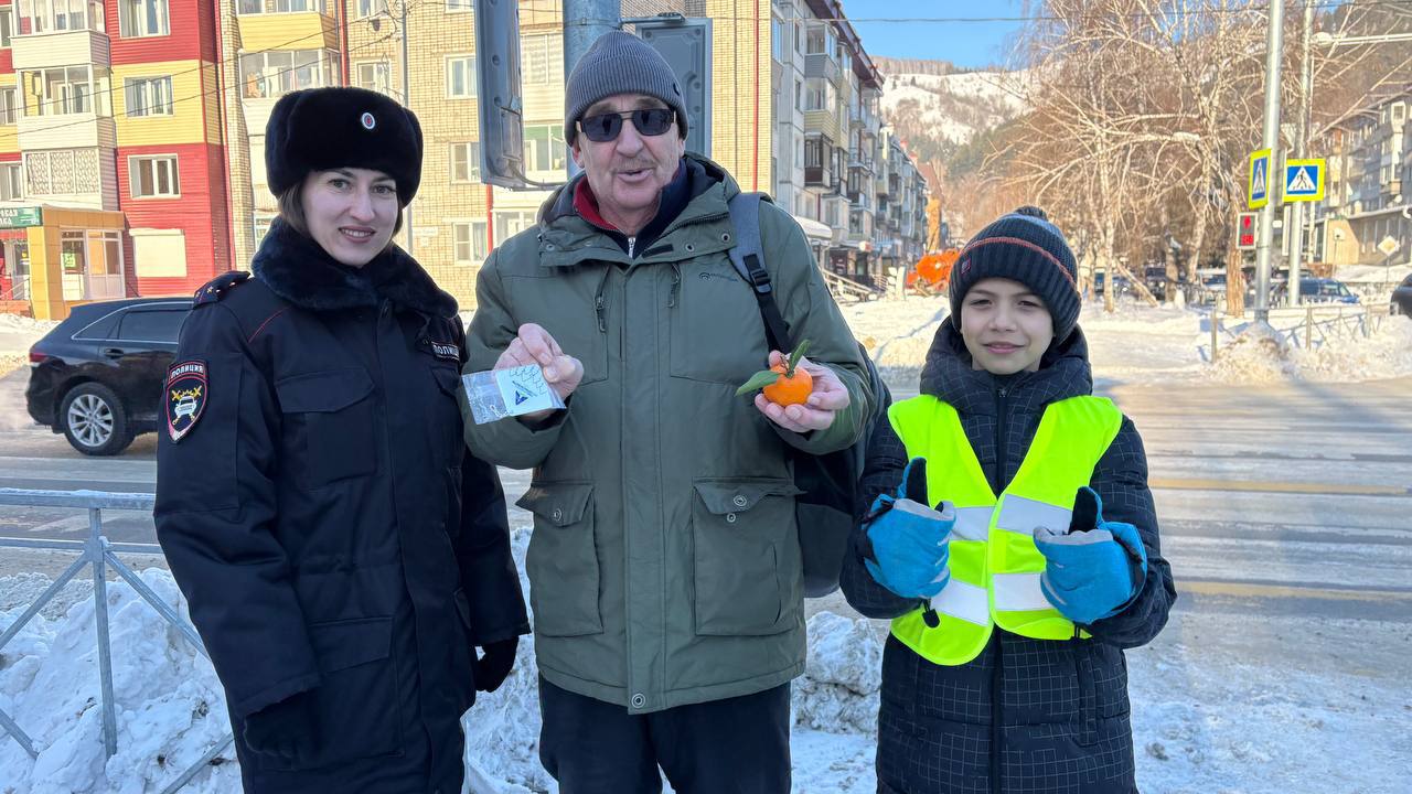 Вместо привычных разговоров о нарушениях горожане получали добрые пожелания, полезные советы и необычные подарки: световозвращающие брелоки и новогодние мандарины. Яркий брелок — это не просто сувенир, а реальный способ стать заметнее на дороге водителю. А сладкий фрукт создавал по-настоящему праздничное настроение.