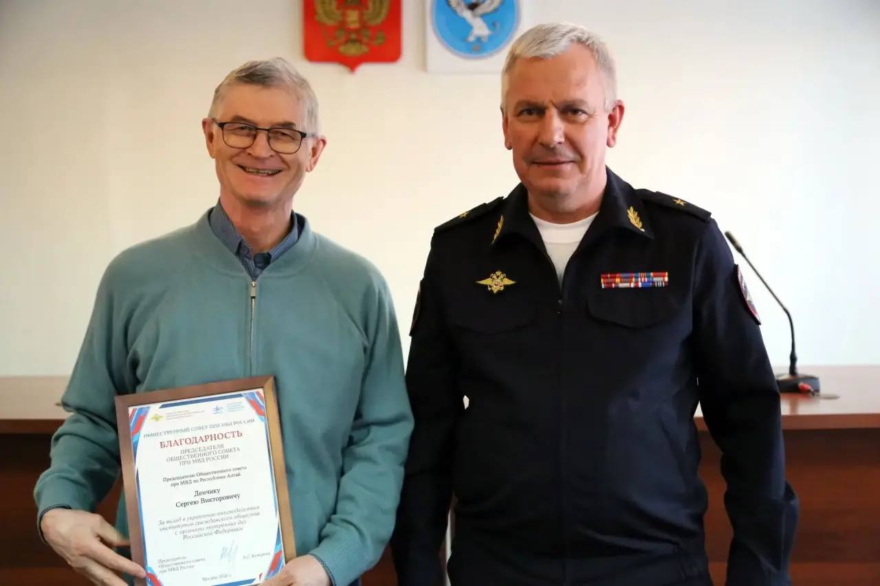 За вклад в укрепление взаимодействия институтов гражданского общества с органами внутренних дел РФ благодарственным письмом Общественного совета МВД России награжден Председатель Общественного совета при МВД по Республике Алтай Сергей Денчик.