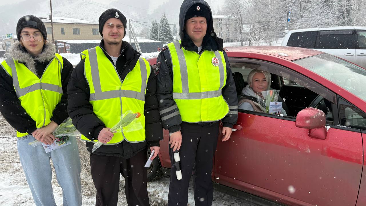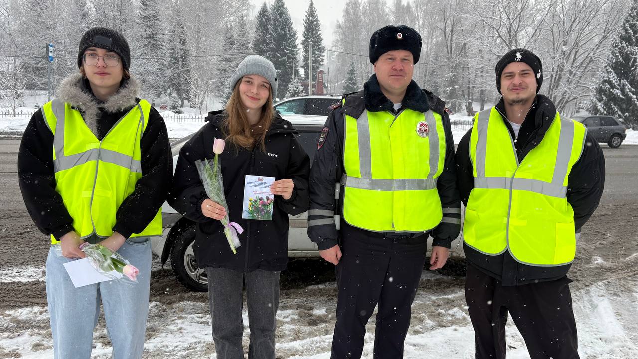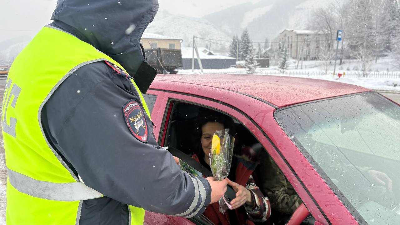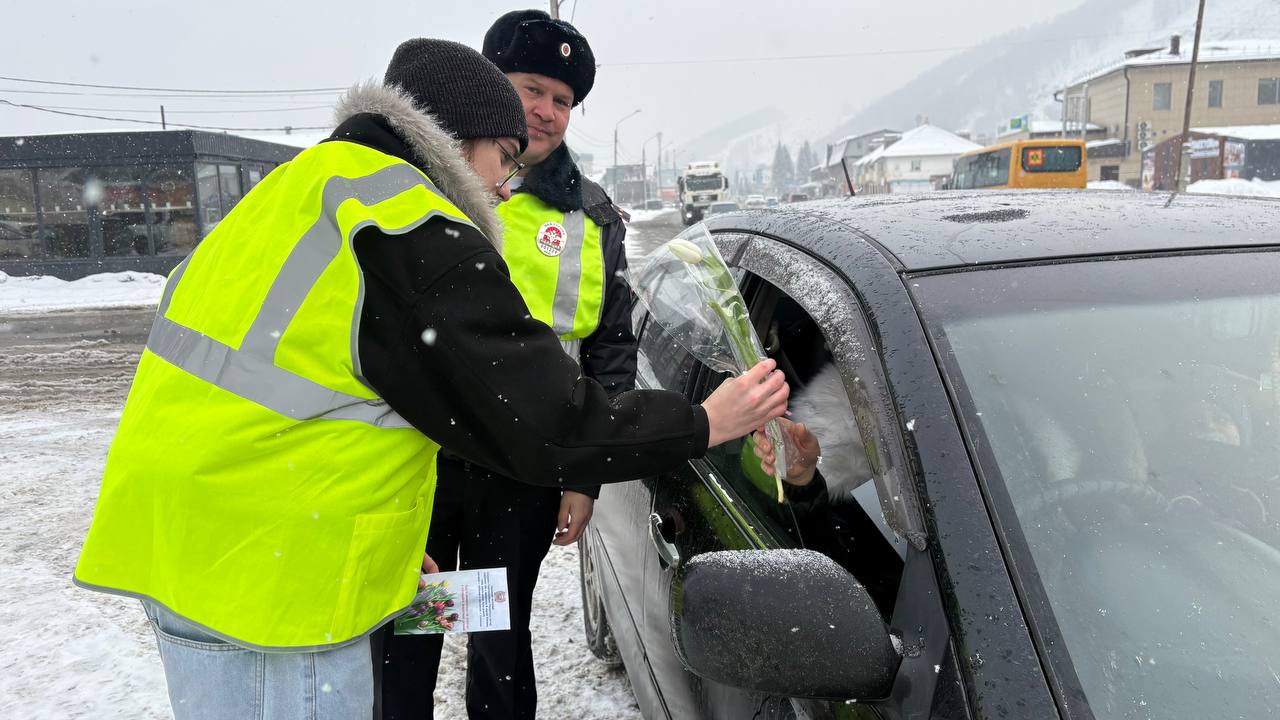 В преддверии Международного женского дня в селе Майма прошла традиционная праздничная акция. Сотрудники Госавтоинспекции совместно со студентами Горно-Алтайского политехнического колледжа имени М.З. Гнездилова вышли на дороги, чтобы поздравить прекрасную половину водителей с наступающим праздником.