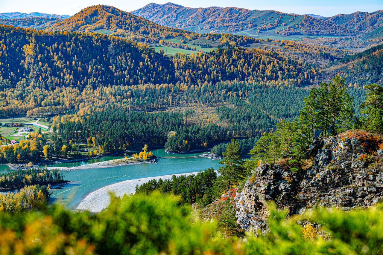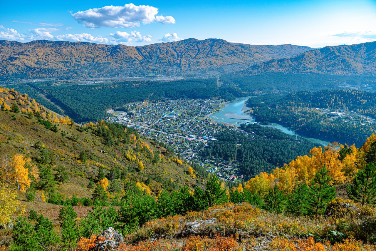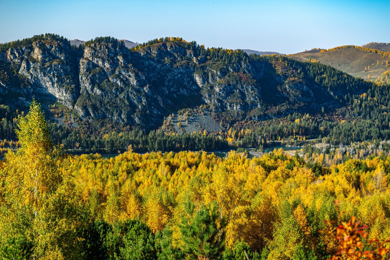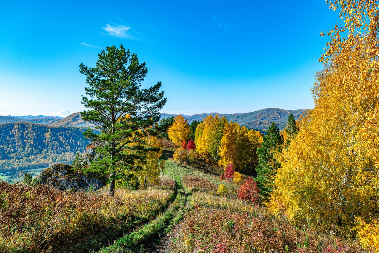 Гора Черепан рядом с Манжероком. Осенью там необычно яркие цвета деревьев, переливающихся на солнце, с самой вершины горы открываются необычные панорамные виды, и всё село Манжерок как на ладони.
