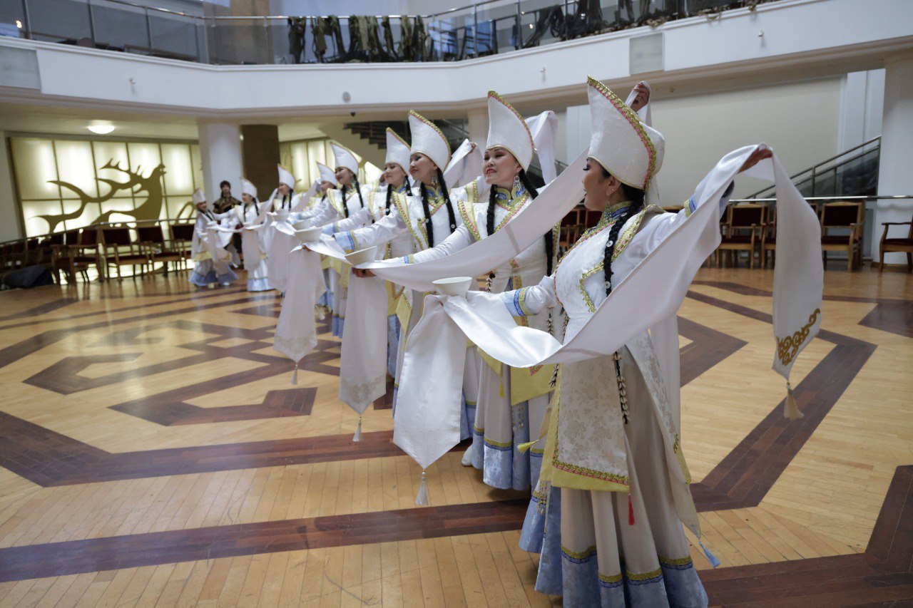 Пресс-конференция открылась тепло и искренне. Артисты Государственного национального театр танца и песни «Алтам» крепко обнялись с прибывшими коллегами по хореографическому цеху. «Алтам» подарил гостям приветственный танец «Уткуул».