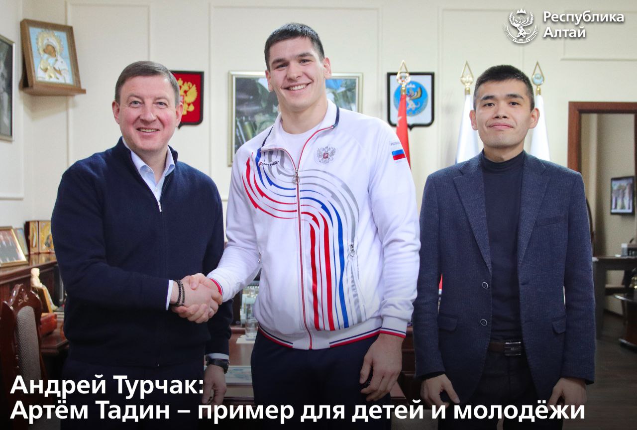Глава Республики Алтай Андрей Турчак встретился с чемпионом мира по боевому самбо Артёмом Тадиным и поздравил его с победой.
