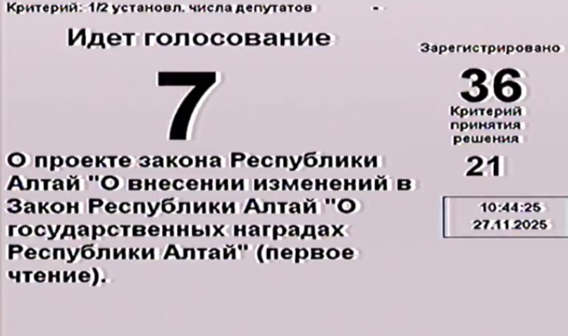 В ходе XII сессии Государственного Собрания – Эл Курултай приняты важные изменения в закон о государственных наградах Республики Алтай. Необходимость принятия проекта закона связано с изменением норм современного алтайского литературного языка, используемого в качестве государственного языка Республика Алтай, и утверждением Правил орфографии.