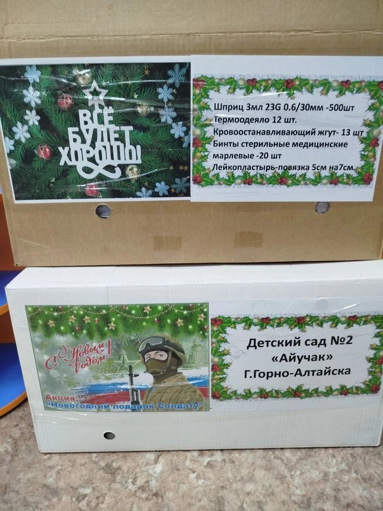 В Горно-Алтайске воспитанники детского сада №2 «Айучак» вместе с родителями и педагогами подготовили посылку для военнослужащих. В ней — не только медицинские принадлежности (жгуты, шприцы, капельницы), но и самое ценное — детские рисунки с пожеланиями здоровья и скорого возвращения домой.