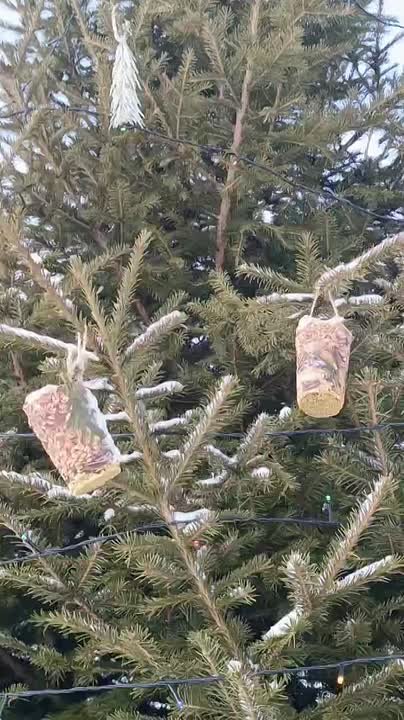 Живую ёлку украсили ледяными кормушками, которые птицы съедят без остатка.