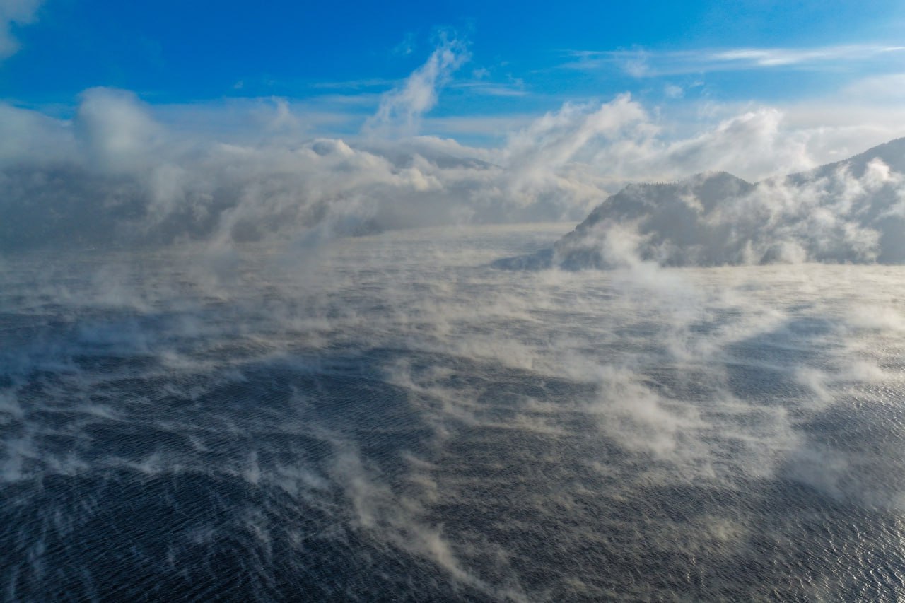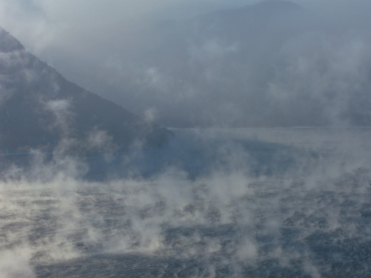 Когда наступают морозы, озеро начинает парить – чем холоднее, тем интенсивнее туман.