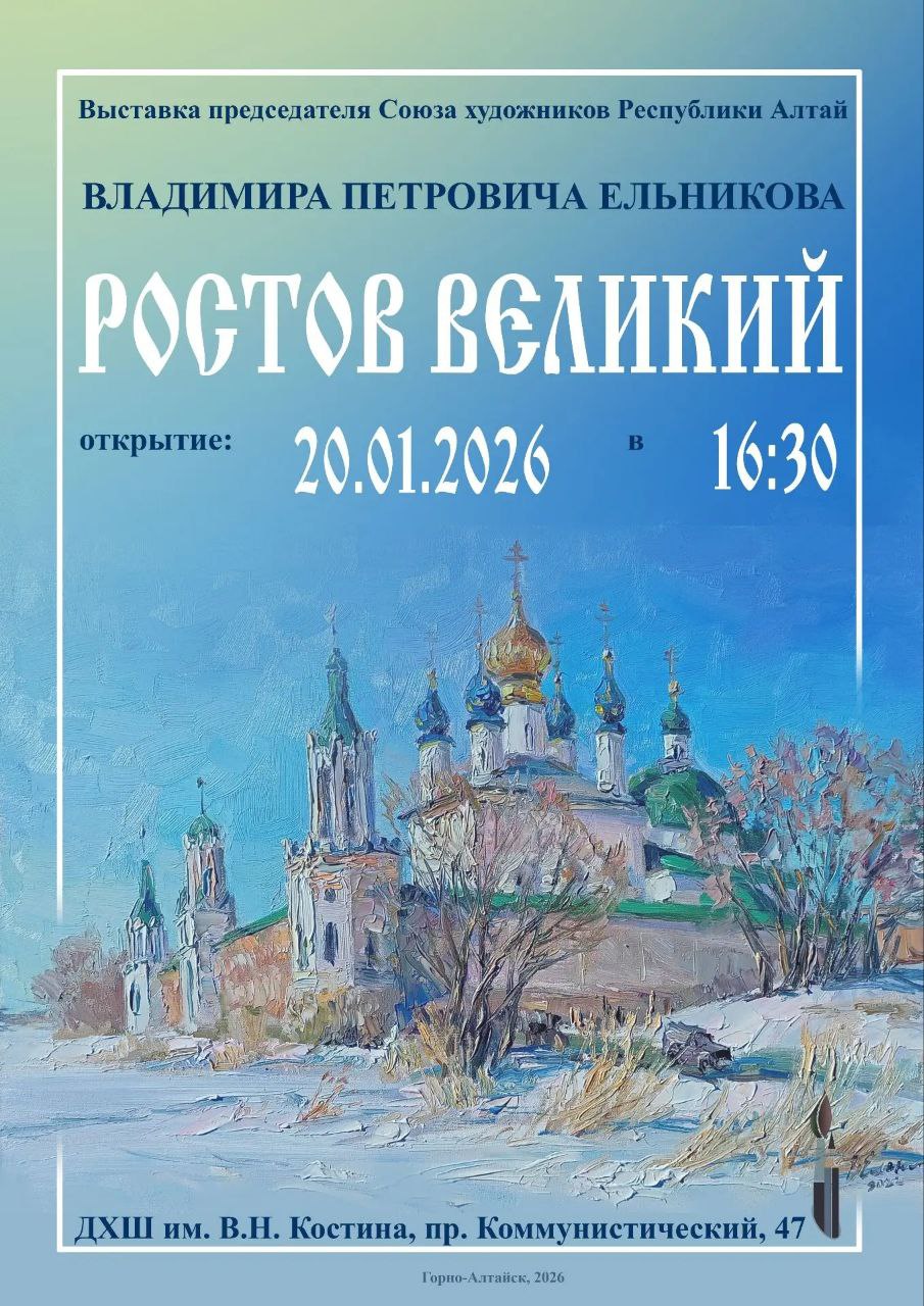 20 января в 16:30 в выставочном зале детской художественной школы им. В.Н. Костина состоится открытие персональной выставки «Ростов Великий» городского художника, мастера пейзажа, председателя Регионального отделения Союза художников РА Владимира Ельникова.
