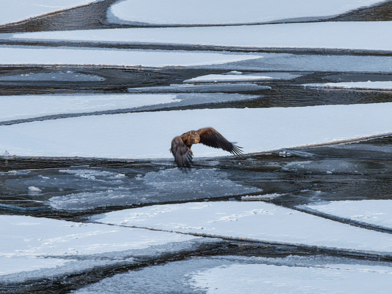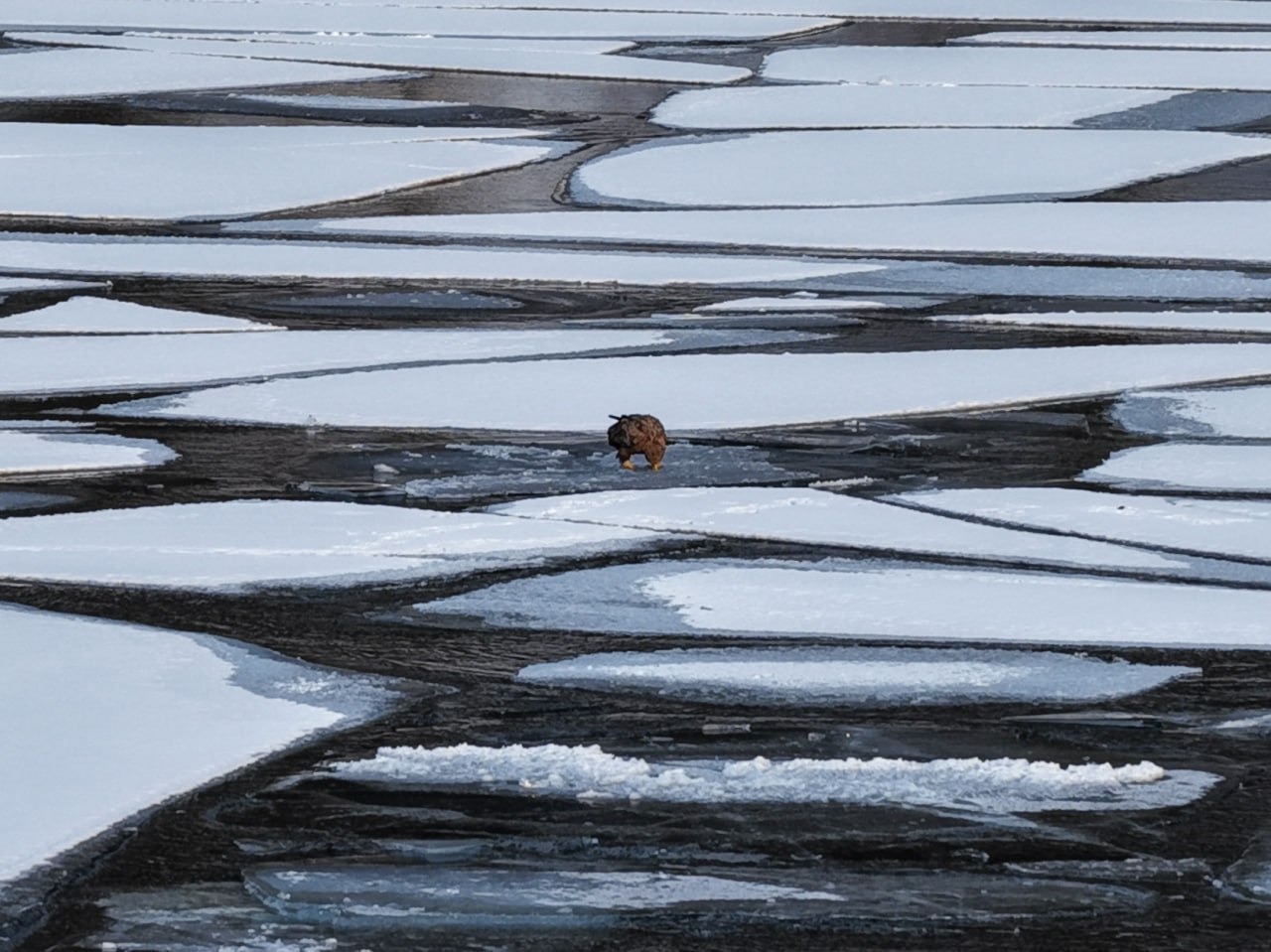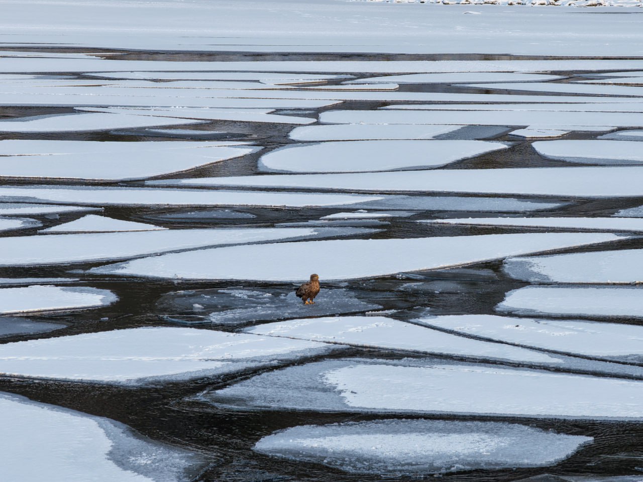 Зимующий на Телецком озере орлан-белохвост использует плавающие льдины как площадки для отдыха и стол.