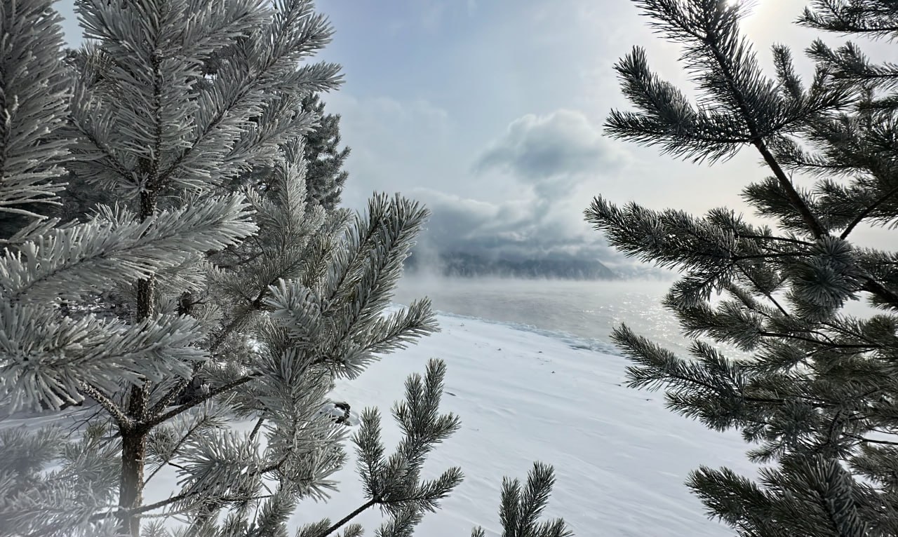 Телецкое озеро встречает весну по-зимнему: -26°C и морозные туманы.