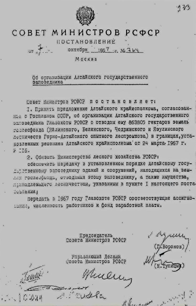 7 октября 1967 года вышло Постановление Совета Министров РСФСР №764 «Об организации Алтайского заповедника». Это Постановление определило судьбу Алтайского заповедника, который уже дважды закрывался, но неизменно возрождался.