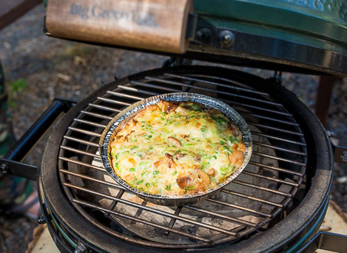3. Запекание на гриле: Используя жаропрочную сковороду или чугунную форму, смажьте оставшимся маслом и вылейте в неё яично-грибную смесь. Установите форму на решётку гриля, накройте крышкой или фольгой и готовьте 15-20 минут на среднем огне, пока фриттата не затвердеет и слегка не подрумянится сверху. За 5 минут до окончания приготовления можно добавить немного сыра для создания румяной корочки.