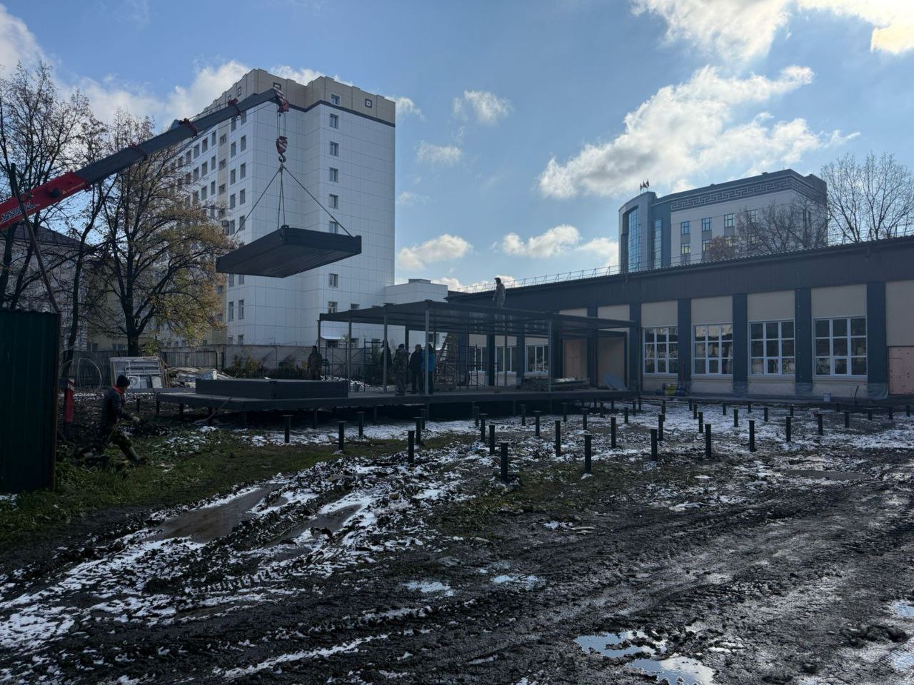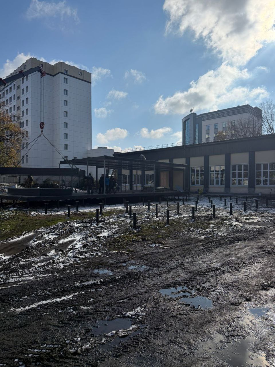 На террритории школы начат монтаж модульного здания для обеденного зала. Процесс запечатлела на фото. Это дополнительные помещения для нужд лицея, которые возводятся по поручению Главы региона Андрея Турчака при поддержке группы компаний «Эталон».