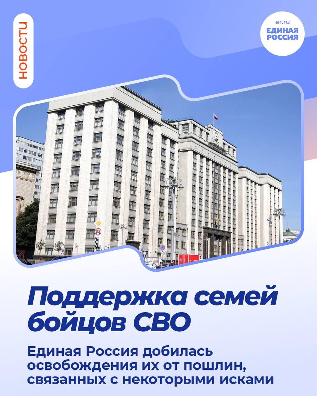 Единая Россия добилась освобождения семей участников СВО от уплаты пошлины при обращении за назначением пенсии по потере кормильца. Законопроект принят Госдумой в третьем чтении.