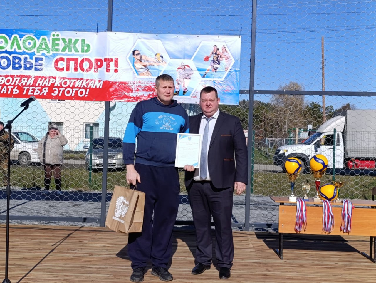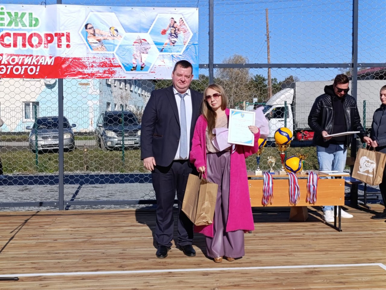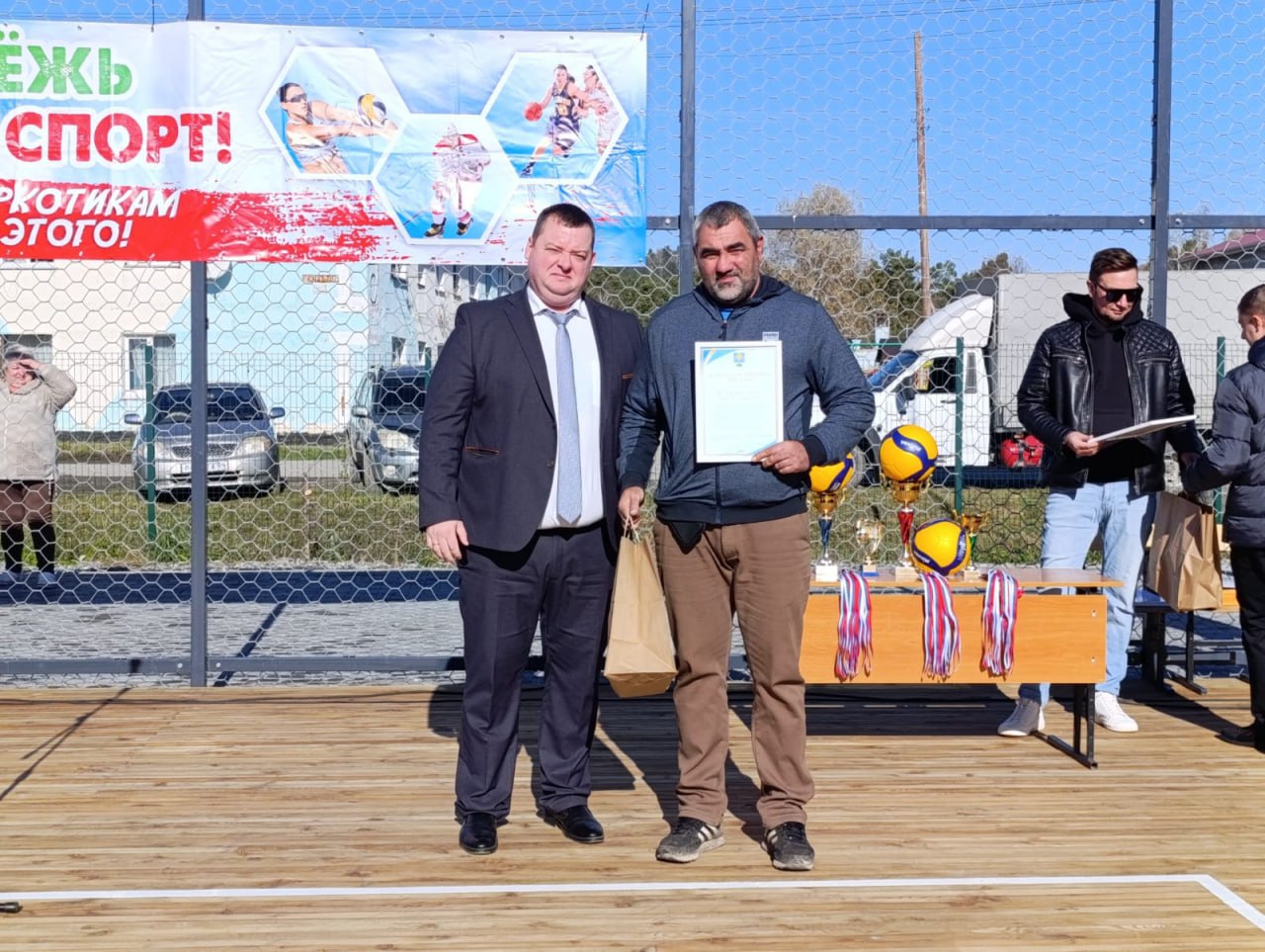 Глава района Петр Громов вручил благодарственные письма индивидуальному предпринимателю Татьяне Лыковой, занимавшейся строительством площадки, а также волейболистам Егору Фомкину и Константину Бучневу, много лет играющих за сборную района.