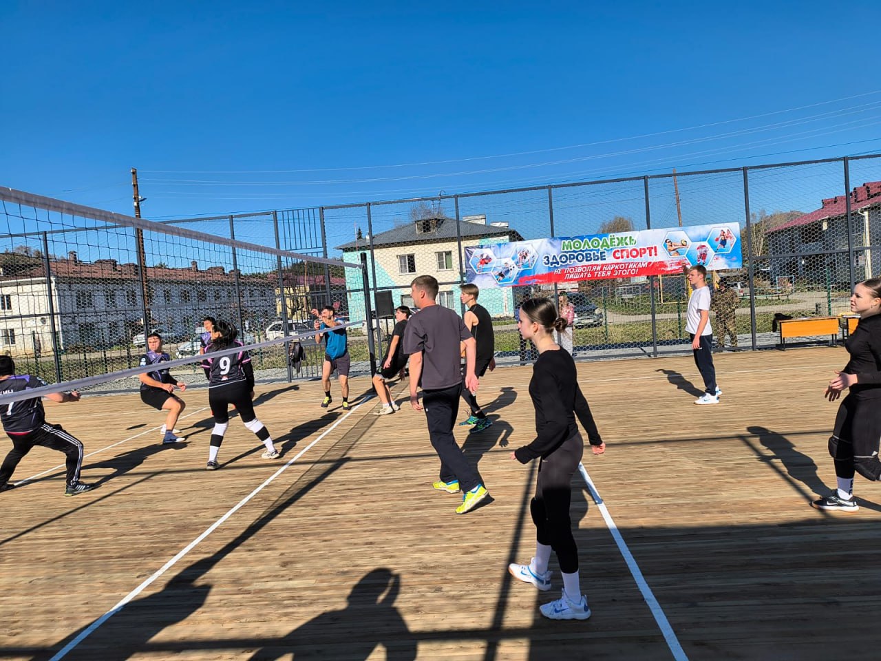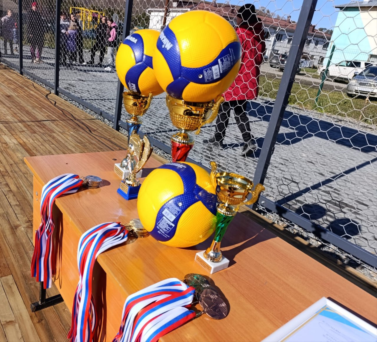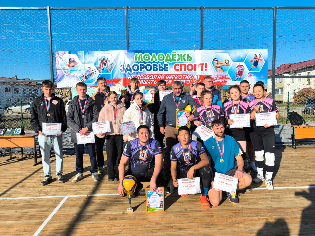 Глава района Петр Громов вручил благодарственные письма индивидуальному предпринимателю Татьяне Лыковой, занимавшейся строительством площадки, а также волейболистам Егору Фомкину и Константину Бучневу, много лет играющих за сборную района.