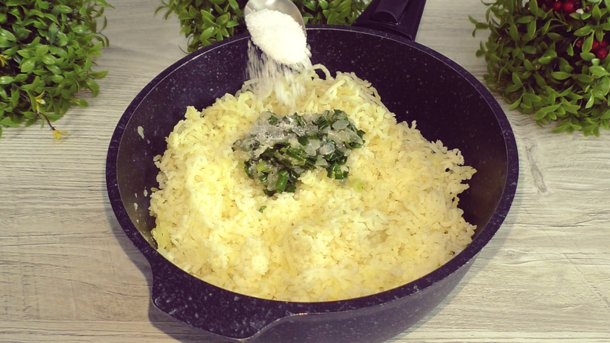 Картофель варится в подсоленной воде, затем тщательно разминается. Лук обжаривается до золотистого оттенка с добавлением зелени, после чего смешивается с картошкой. Для лучшей текстуры можно добавить несколько столовых ложек картофельного отвара.