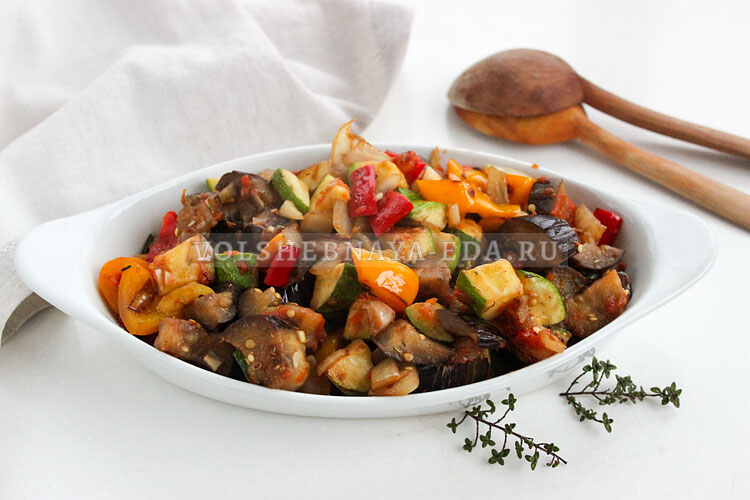 После этого баклажаны отжимаются и обжариваются на сковороде с добавлением масла, после чего их переливают в сотейник с уже готовым томатным соусом, посыпая сушеным тимьяном и чесноком. Затем, использовав оставшееся масло, обжариваются цукини, лук и болгарский перец, чтобы они немного сохранили свою текстуру, и все три овоща добавляются в сотейник с баклажанами.