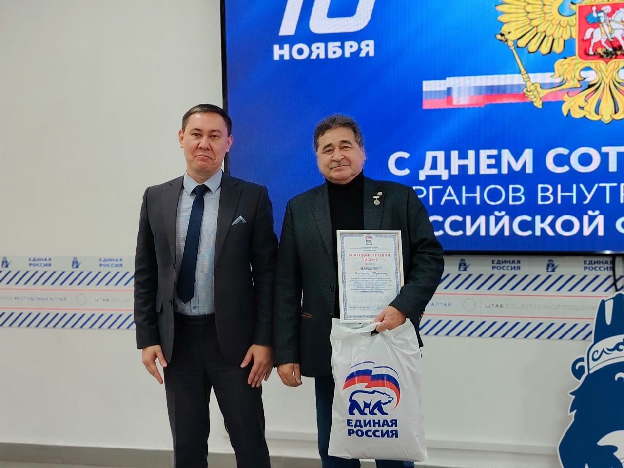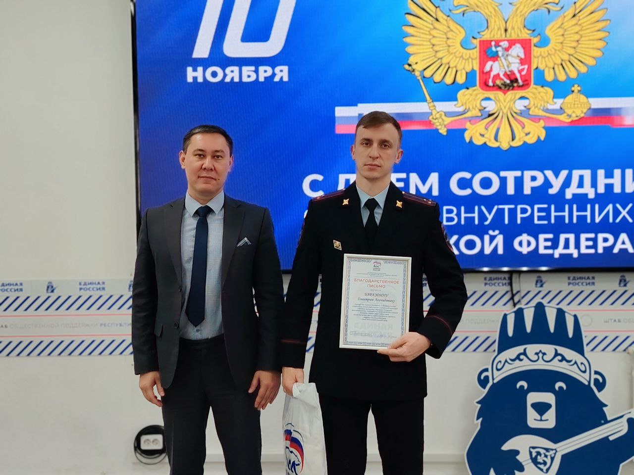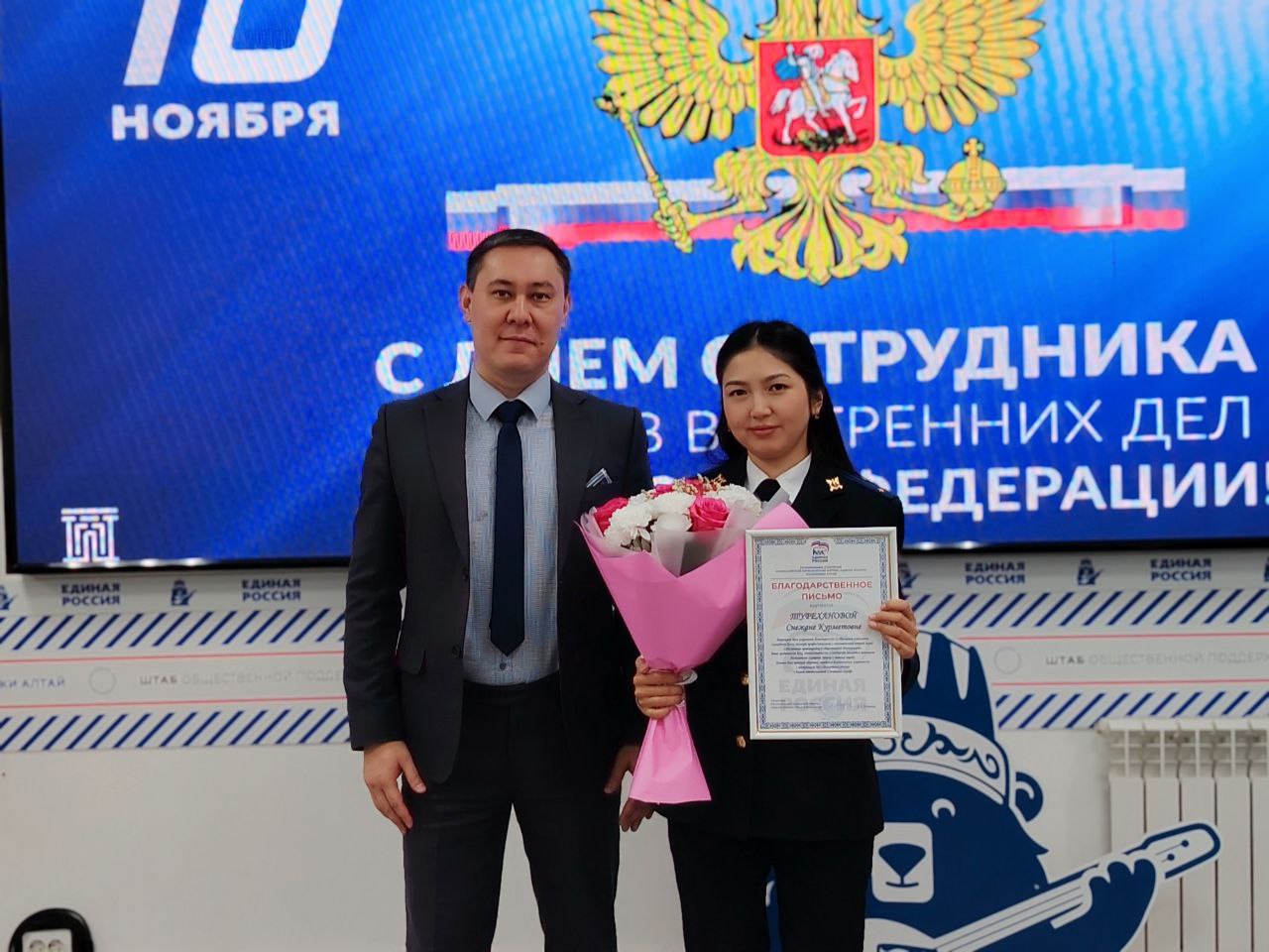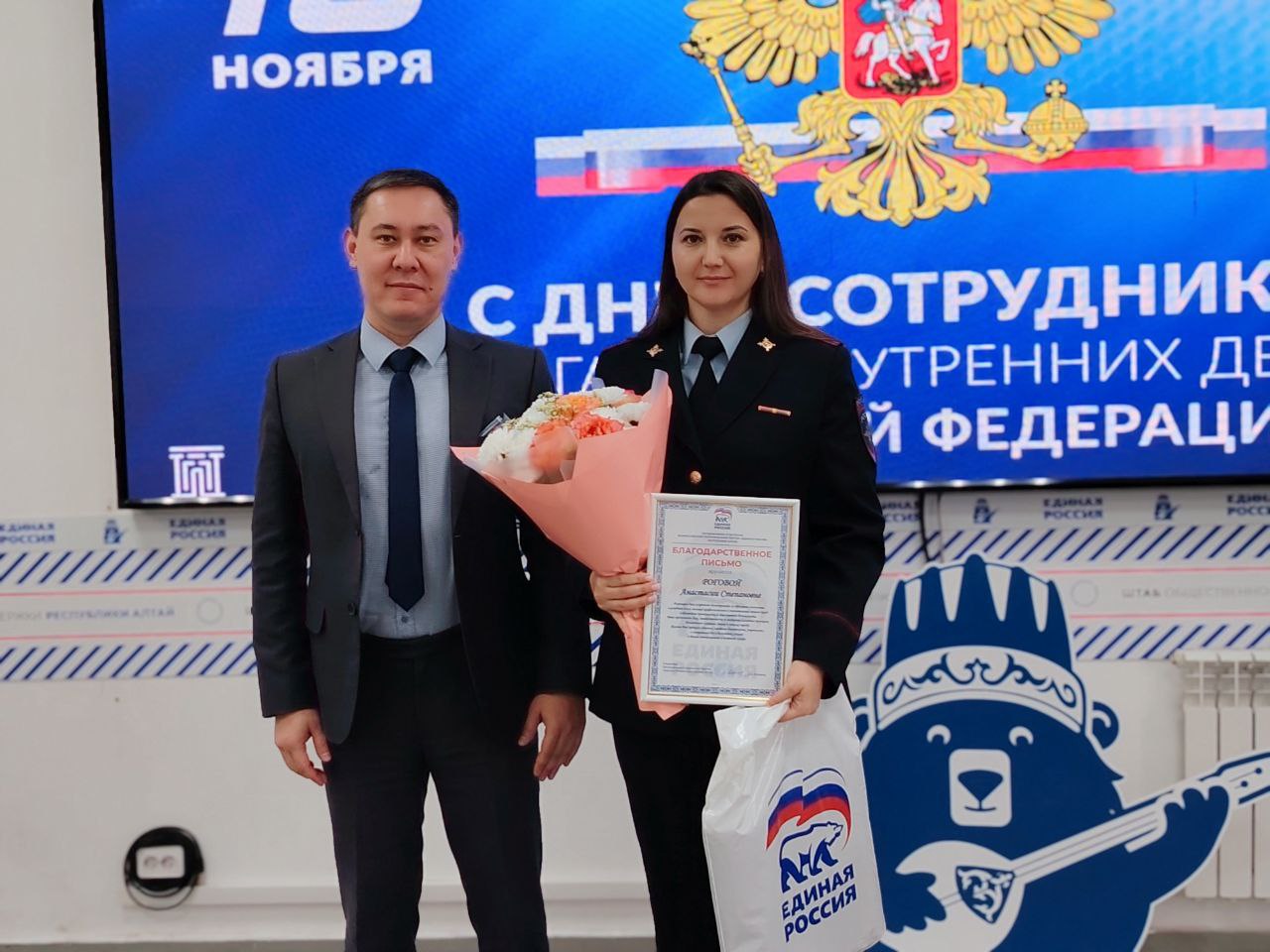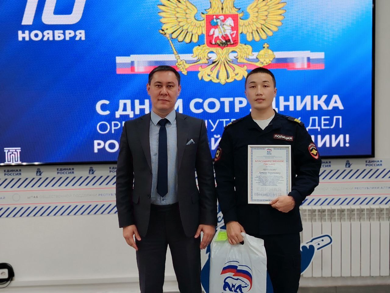 Депутат Госсобрания Республики Алтай Николай Ким от имени секретаря регионального отделения партии «Единая Россия» Эжера Ялбакова вручил благодарственные письма сотрудникам МВД по Республике Алтай за образцовое исполнение служебного долга, профессионализм и вклад в обеспечение правопорядка.