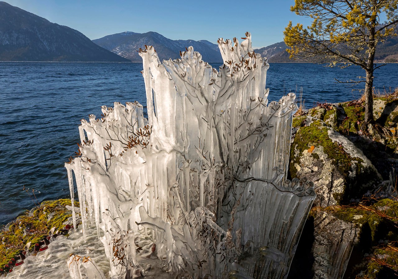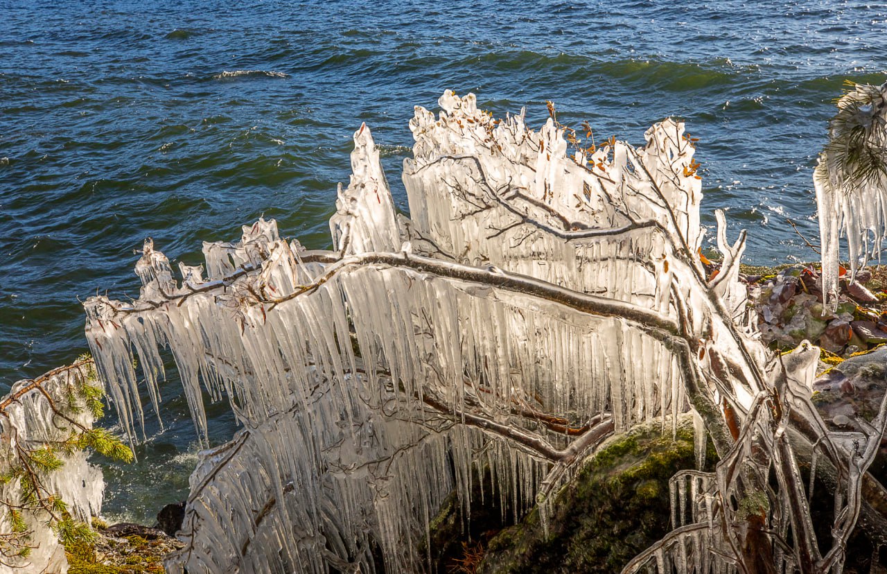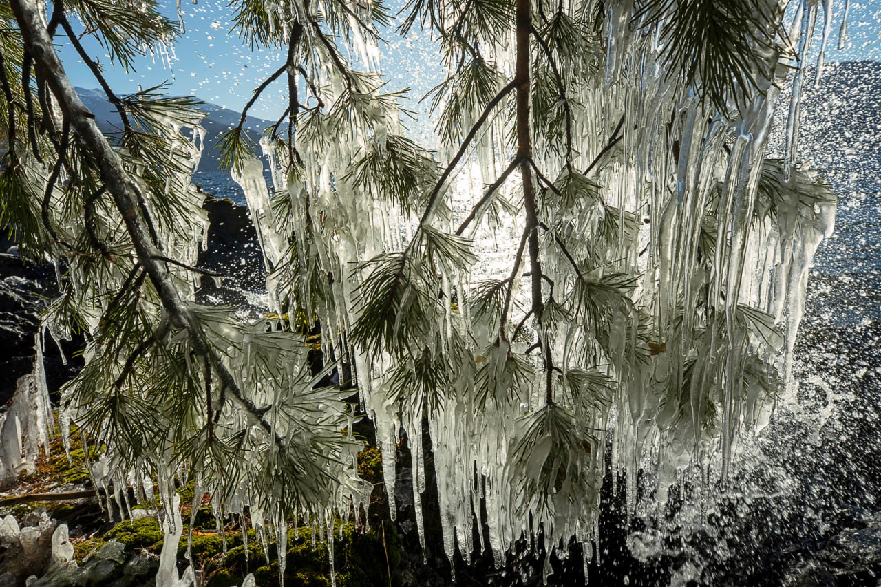 Сильный ветер «верховка» разбивает воду о скалы, а мороз мгновенно заковывает брызги в лёд. Результат — хрустальные наряды на камнях и кустах.