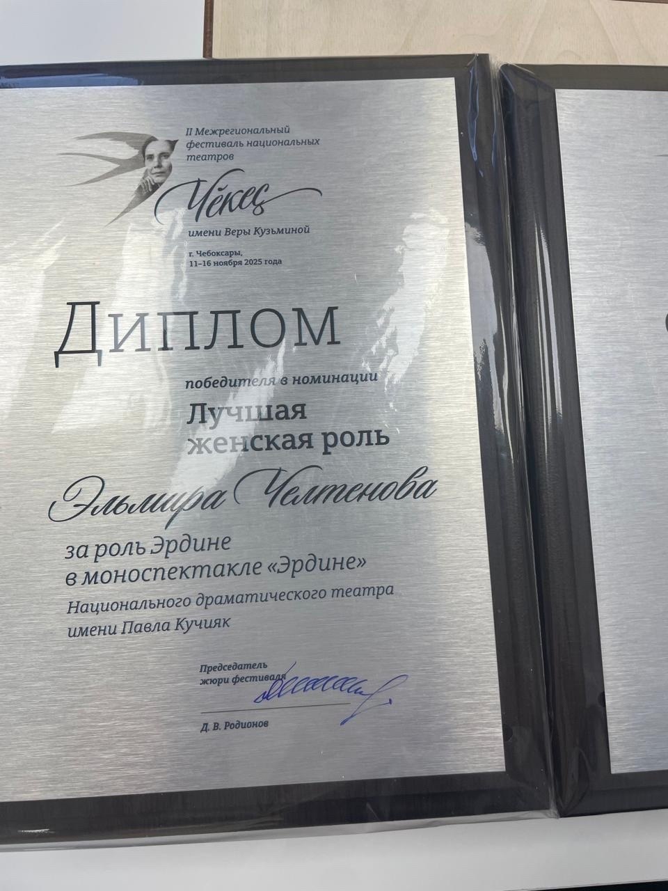 В номинации «Лучшая женская роль» победу одержала наша талантливая актриса Эльмира Челтенова. Она была отмечена авторитетным жюри за глубокое и проникновенное воплощение сложного образа в спектакле «Эрjине» С. Сартаковой в постановке реж. Э. Иришевой