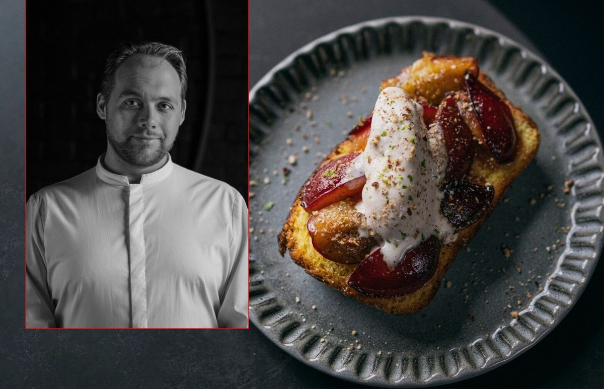Для бриоши смешать все сухие ингредиенты с молоком, затем добавить желтки. После того как тесто станет однородным, вмешать мягкое сливочное масло и оставить отдыхать на 30 минут. Выпекать нужно 30 минут при 150 °C, а после остывания нарезать сливы и обжарить с карамелью.