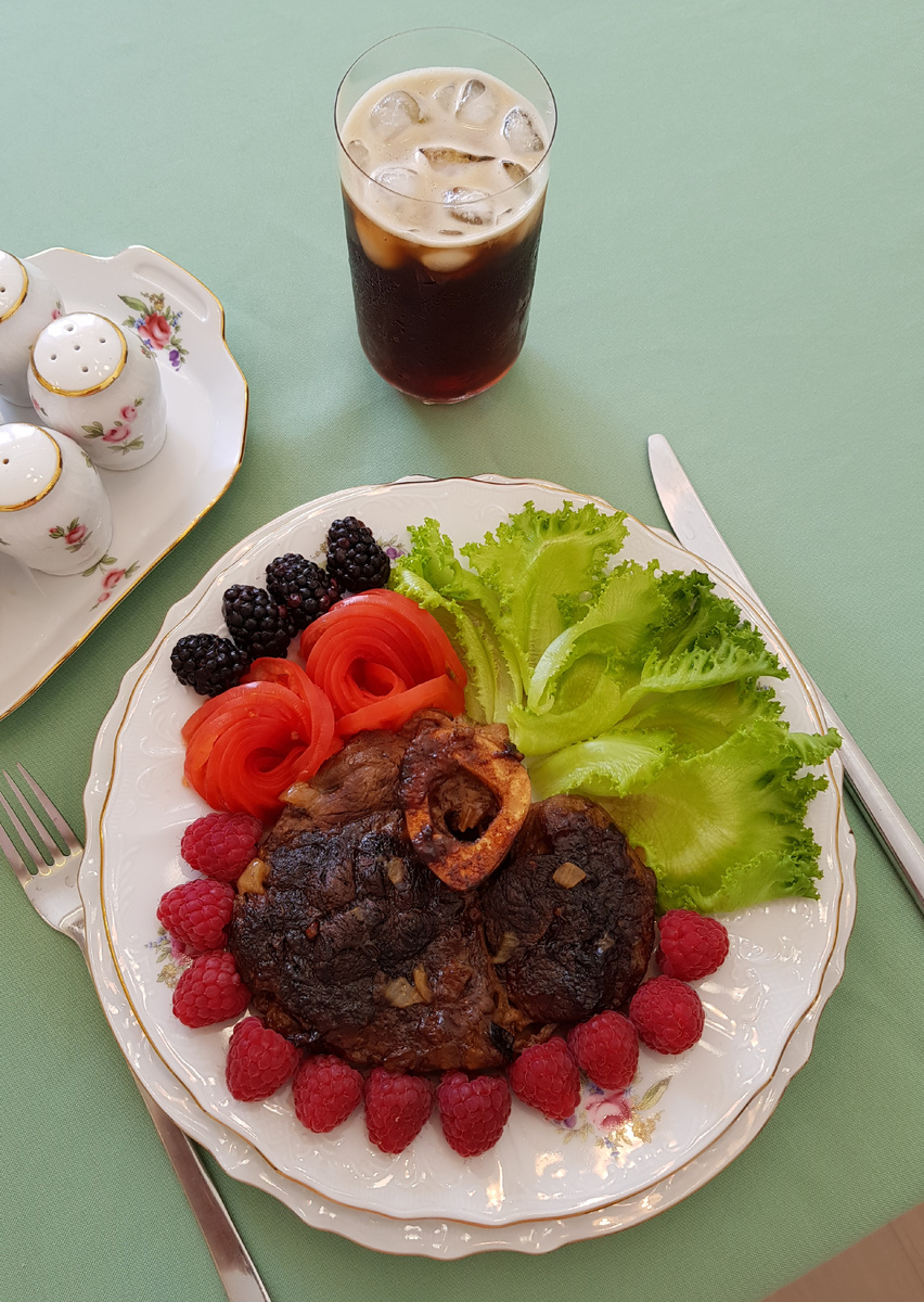 По завершении приготовления, разложите голяшки по тарелкам и дополните их свежими листьями салата, малиной и украшениями из помидоров. Это придаст вашему блюду не только изысканный вид, но и великолепное обрамление. Приятного аппетита!