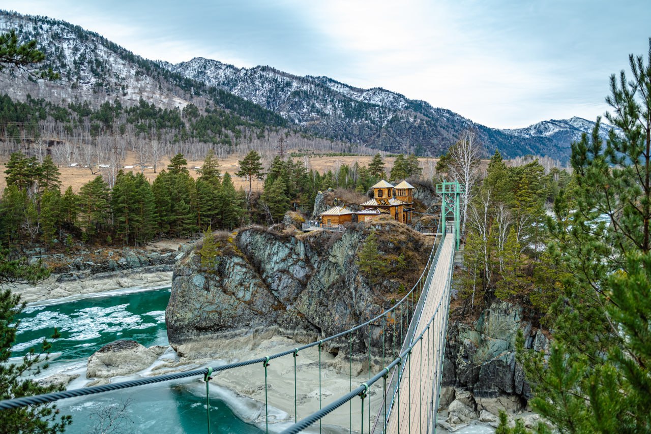 Атмосферный подвесной мост. Переправа на остров проходит по мосту на высоте 15 м над Катунью. Мост ощутимо раскачивается, что добавляет остроты ощущений! Одновременно на нём могут находиться не более 8человек.