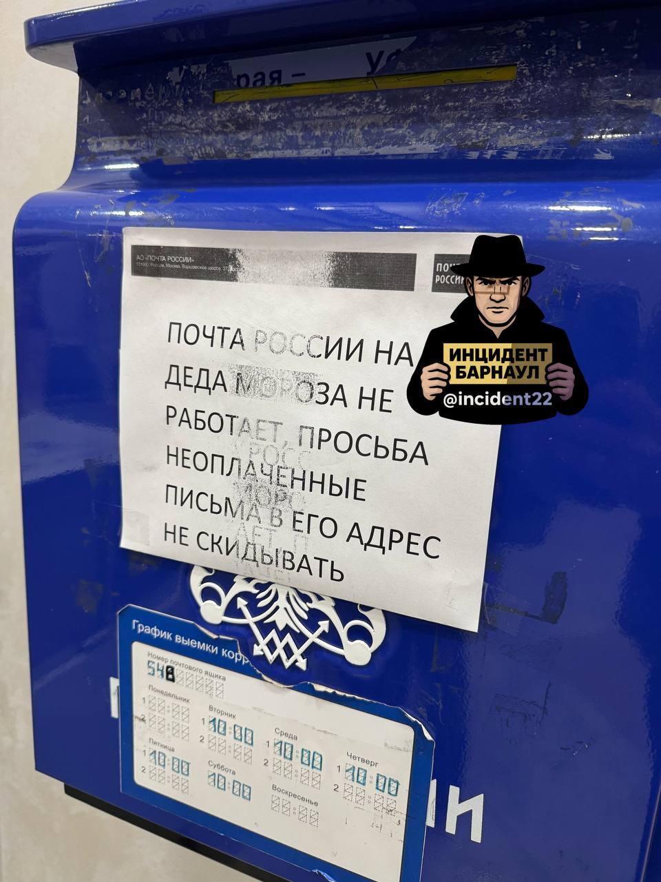 Барнаульский ТРЦ назвал фейком объявление, что «Почта России на Деда Мороза не работает». О такой записке на почтовом ящике торгово-развлекательного центра «Праздничный», сообщили местные паблики.