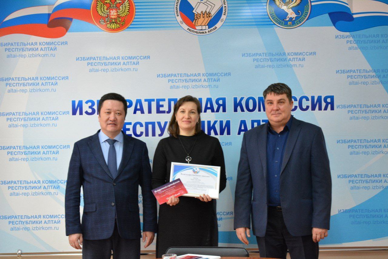 В Избирательной комиссии Республики Алтай состоялось награждение участников регионального этапа Всероссийского конкурса среди работников региональных и муниципальных библиотек на лучшую организацию информационно-разъяснительной работы в период проведения подготовки и проведения выборов в органы государственной власти и органы местного самоуправления в Российской Федерации, работы которых были направлены для участия в федеральном этапе конкурса.