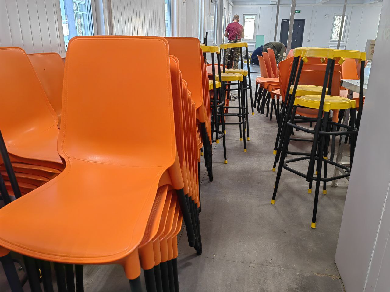 В новой просторной столовой идет укладка линолеума. Мебель завезена и ожидает, когда займёт свое место.