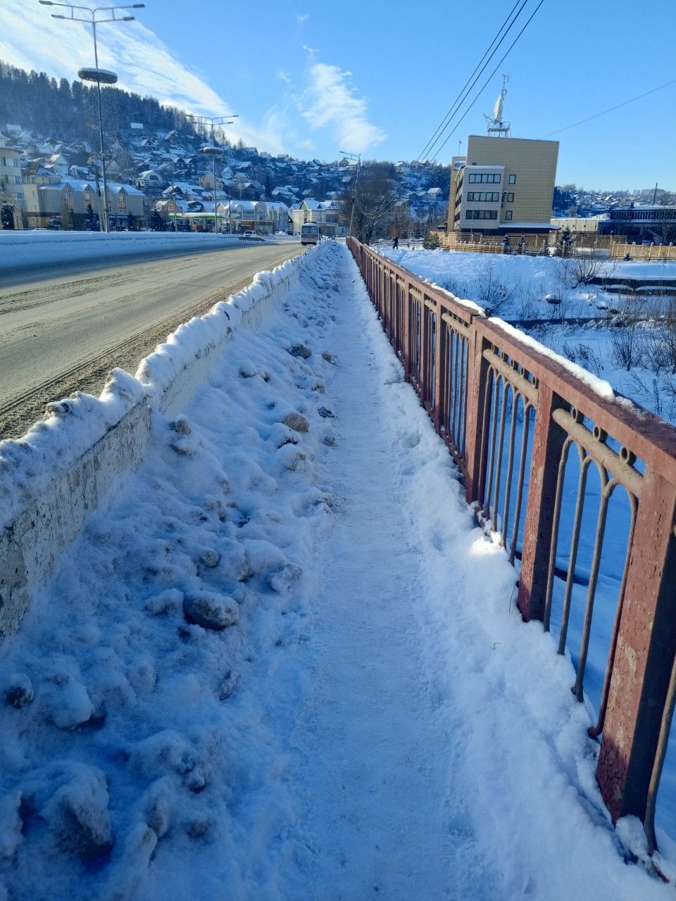 1 Никак не могут почистить проход для пешеходов на мосту через Майму на Мебельной.