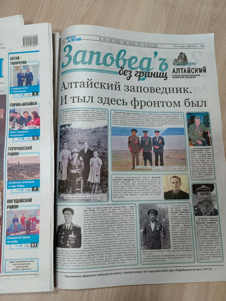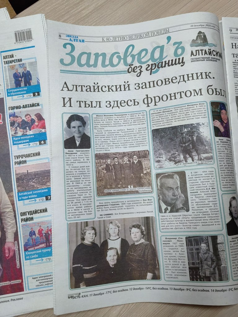 В декабре 2025 года вышел 18-й спецвыпуск газеты Алтайского заповедника «Заповедь без границ». Он посвящён 80-летию Великой Победы и опубликован в республиканской газете «Звезда Алтая».
