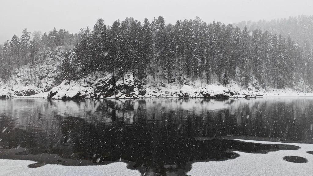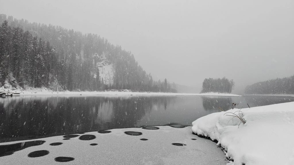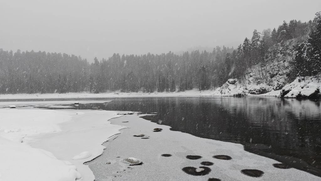 Сегодня она решила не добавлять краску в реку, лес и горы. Тишина окутала природу, и все вокруг словно замерло в ожидании.