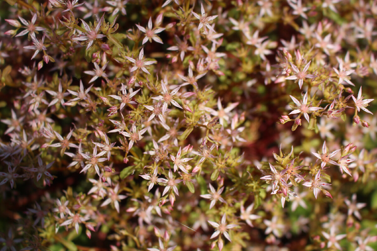 - Красота цветения: Седум радует глаз своими розовыми цветками. Чем больше солнечных лучей, тем ярче и насыщеннее окрас лепестков, что придаёт саду уникальный шарм.