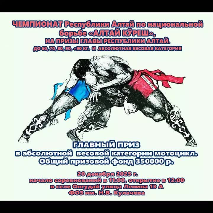 Чемпионат Республики Алтай по национальной борьбе «Алтай Креш» на призы главы Республики Алтай. До 60, 70, 80, 90, +90 кг. и абсолютная весовая категория.