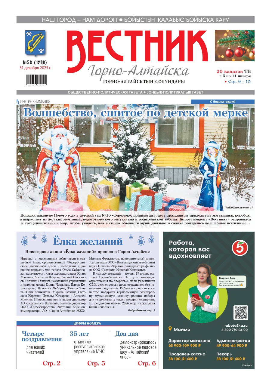 Также в номере – репортажи с первого в Горно-Алтайске ледового шоу и республиканского турнира на призы Деда Мороза по стрельбе из лука, афиша культурных событий и много другой полезной информации.