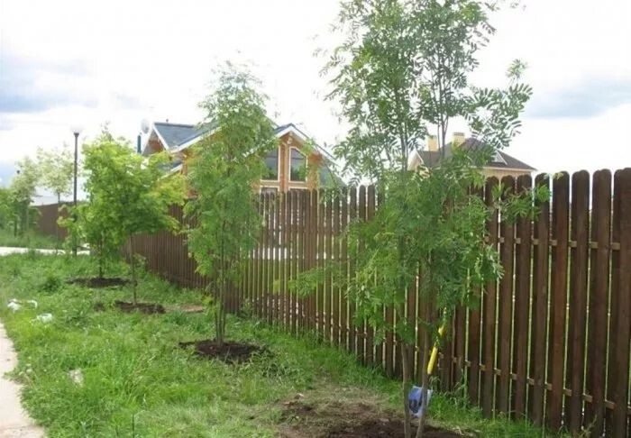 - Высокорослые деревья (дуб, берёза, клен) — расстояние не менее 4 метров от границы.