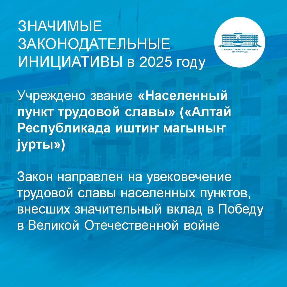 Закон о почетном звании «Населенный пункт трудовой славы» («Алтай Республикада ишти магыны jурты») принят по инициативе жителей села Акташ и Улаганского районного Совета депутатов.