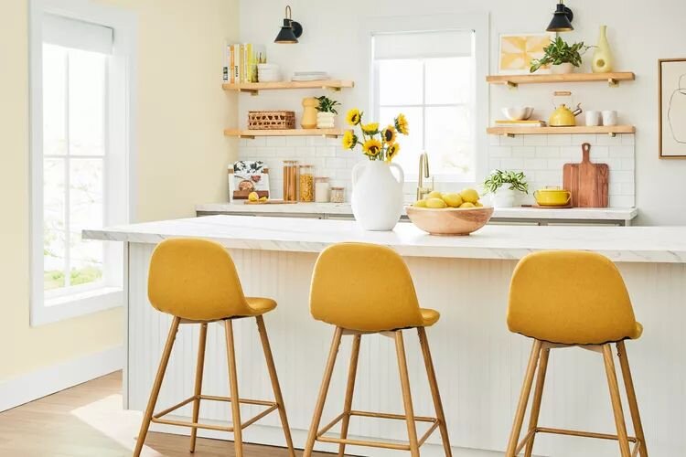 - Кухонные шкафы в лимонном цвете: Подбросьте солнечную нотку в вашу кухню, установив желтые шкафы и табуреты на фоне белых стен и светлого фартука.