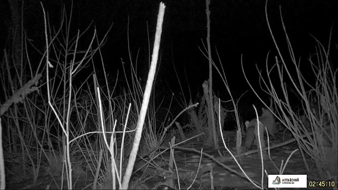 Видеорегистратор в Алтайском заповеднике записал, как лисица испугалась, увидев речного бобра. Но поняв, что он ей не угрожает, вернулась, чтобы посмотреть, чем он таким занят. Позже, когда лисица ушла, бобр все же занялся своим делом.