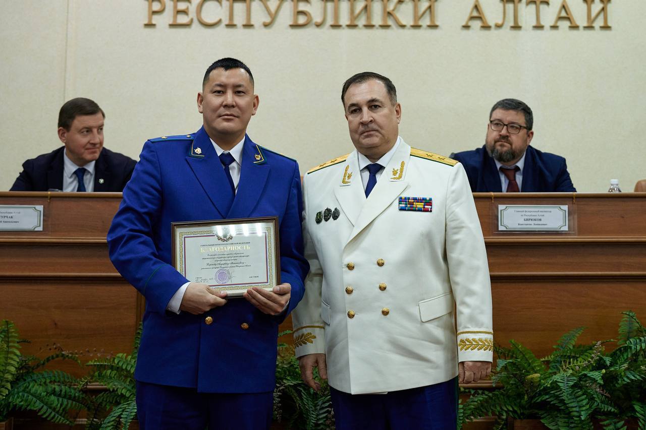 Правительством Российской Федерации объявлена благодарность заместителю прокурора Республики Алтай Вадиму Александровичу Дымову, а ряд ветеранов и сотрудников прокуратуры Республики Алтай награждены за особые заслуги.
