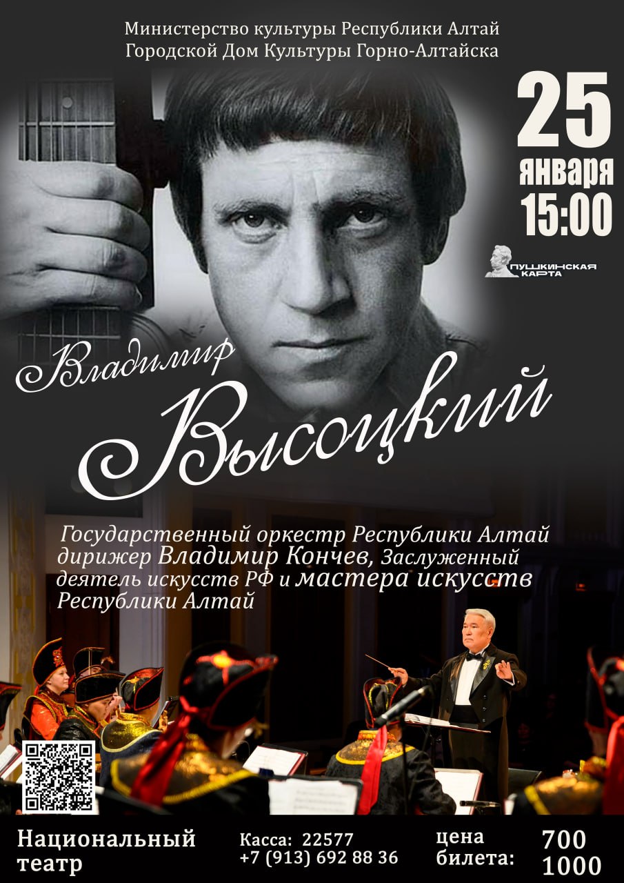 В программе - знакомые многим культовые песни Владимира Семеновича. Солисты выступят под аккомпанемент Государственного оркестра Республики Алтай, главный дирижер — Владимир Кончев.
