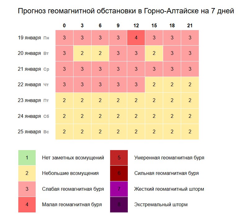 Прогноз геомагнитной обстановки в Горно-Алтайске на 7 дней