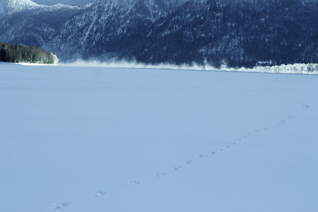 Интересные кадры из Алтайского заповедника. Краснокнижная речная выдра преодолела полтора километра по ледовой глади Телецкого озера.