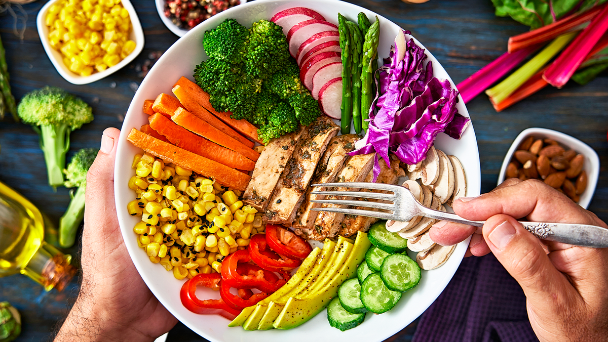 - 1/4 тарелки — белок: разнообразные источники белка, такие как птица, крольчатина, рыба, бобовые, яйца, орехи, тофу, творог и грибы, причем красное мясо рекомендуется употреблять не чаще двух раз в месяц.