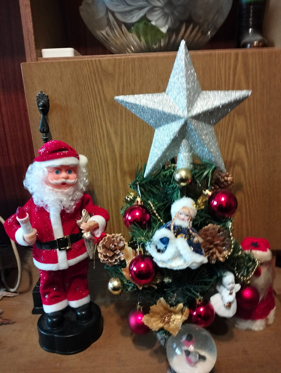 Ёлочка небольшая, но на ней красуется большая звезда. Соседствует с ней музыкальный Дед Мороз, исполняющий 'Джингл Беллс', а сзади притулился ветхий, но все еще живой, подарок, которому более 45 лет.