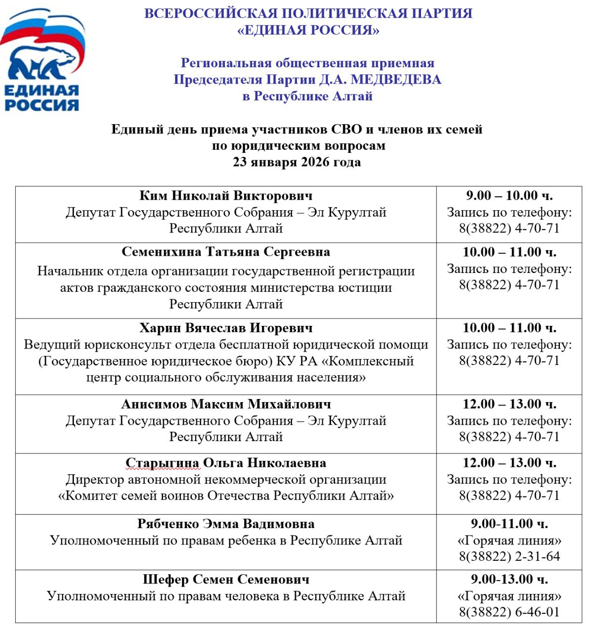 23 января в Региональной общественной приёмной Председателя Партии "Единая Россия" Д.А. Медведева в РА состоится Единый день приема участников СВО и членов их семей по юридическим вопросам