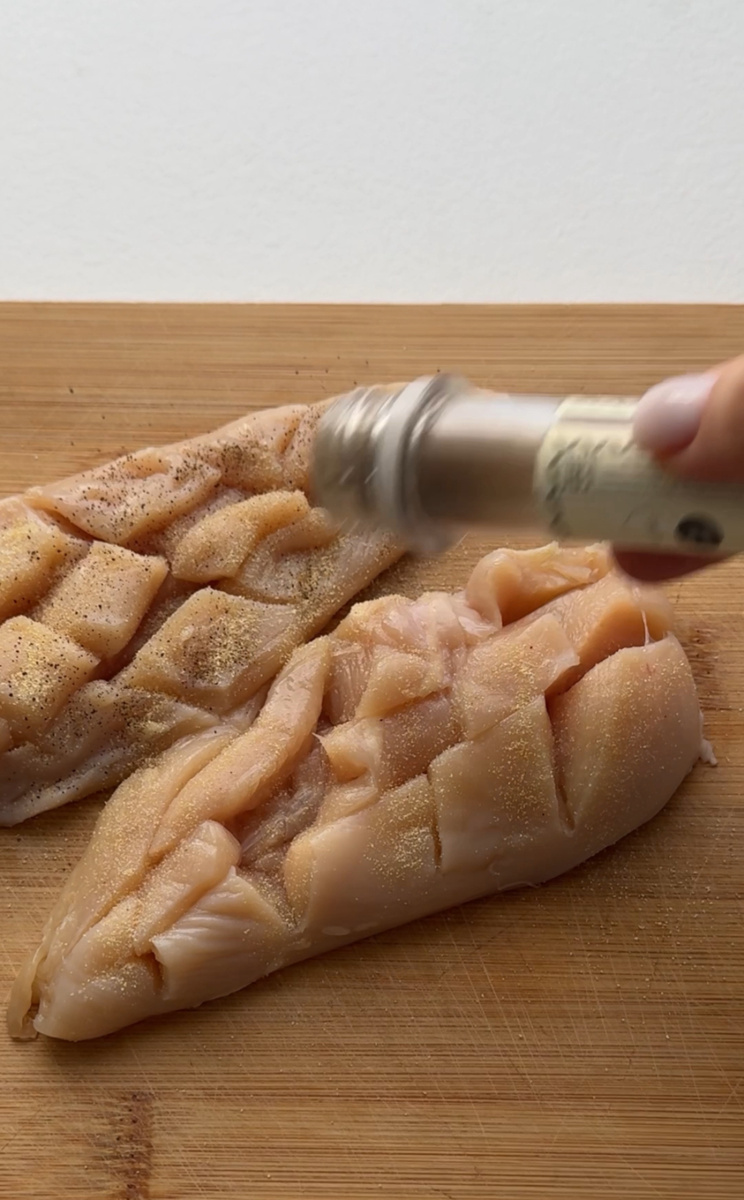 Куриное филе нужно нарезать, замариновать с специями и обжарить на разогретой сковороде по 2-3 минуты с каждой стороны. Затем, убавив огонь, готовить его под крышкой еще 3-5 минут до полной готовности. После этого курицу стоит немного остудить и нарезать кубиками.