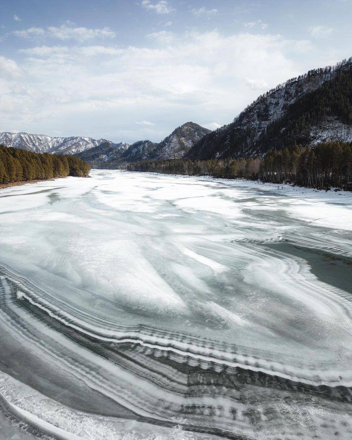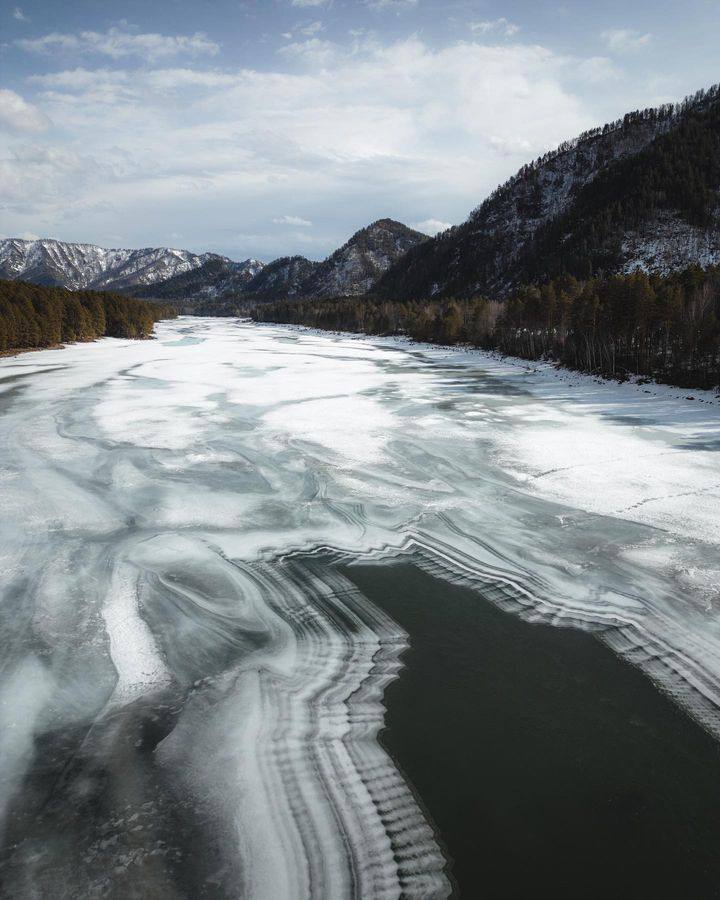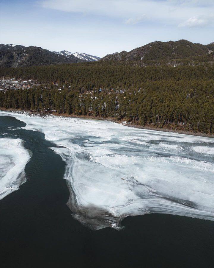 Любуемся видами с высоты птичьего полёта на Катунь, которая грациозно высвобождается из ледяного панциря, чтобы вновь пульсировать во всю мощь.