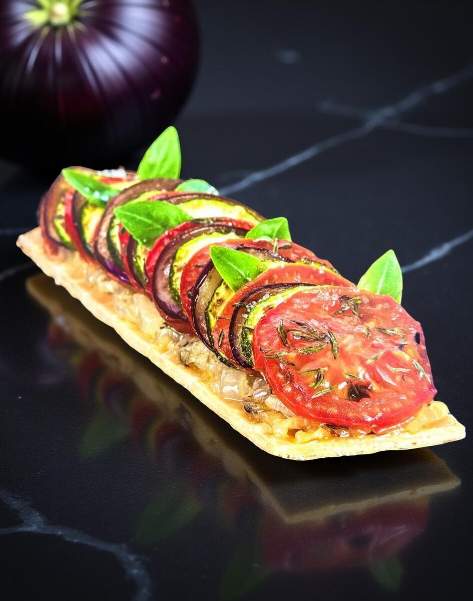Тонкие кружки цукини и баклажанов, помидоры на веточке и лёгкая подвяка солёного вкуса создают основу для ярких слоёв. Всё обжаривается до лёгкого румянца, затем соединяется в единую композицию на тестовой основе.